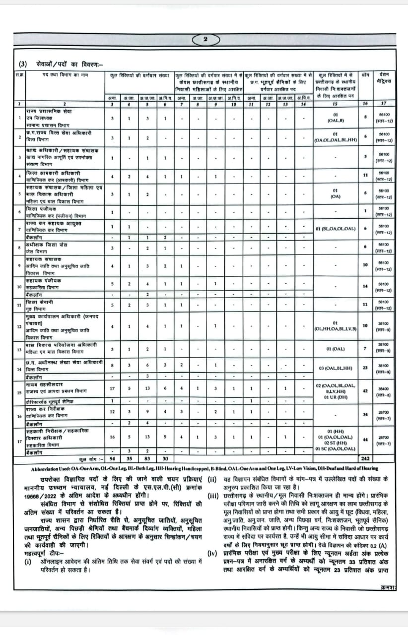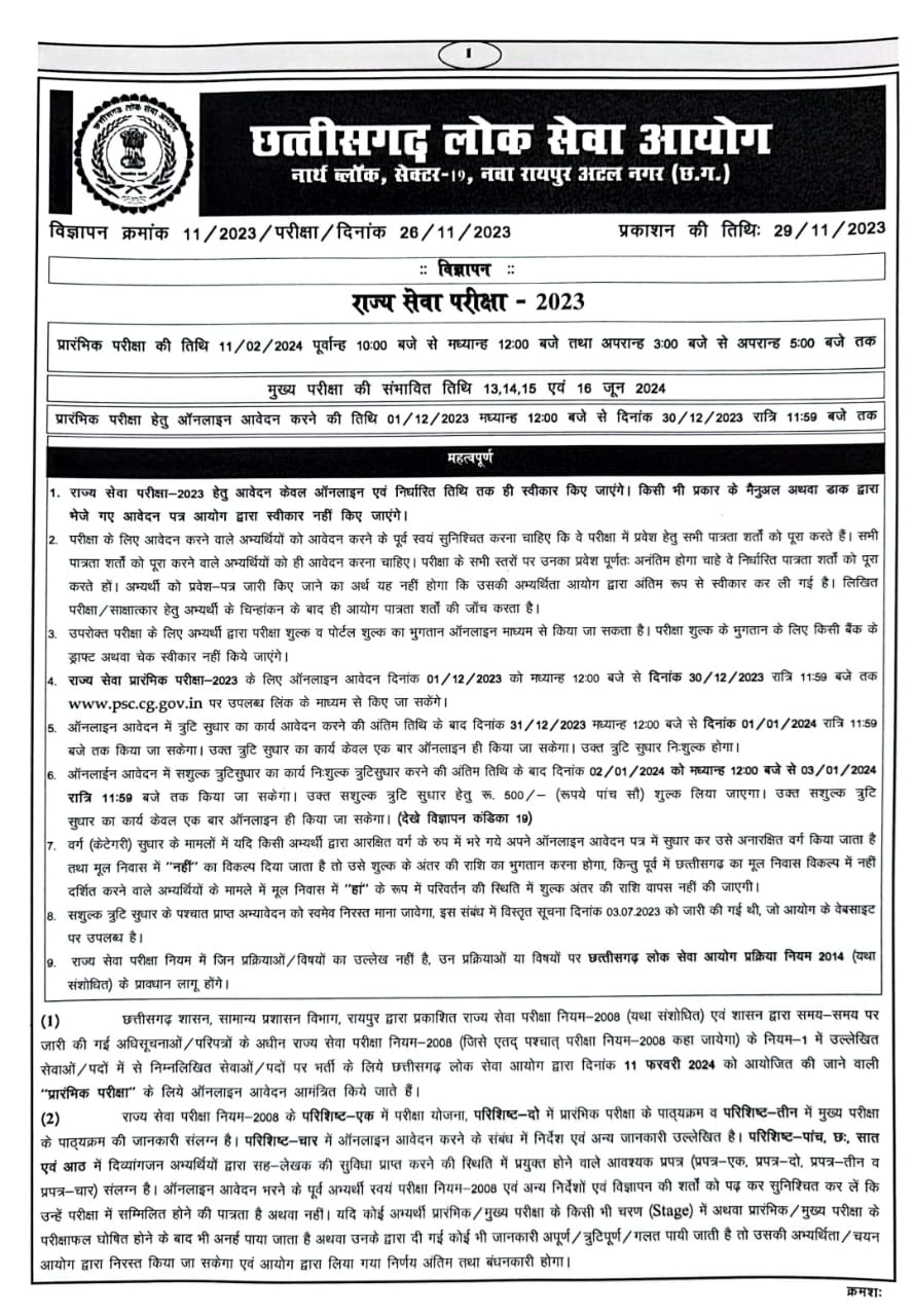 छत्तीसगढ़ लोक सेवा आयोग ने 242 पदों पर भर्ती के लिए अधिसूचना जारी की है। जारी नोटिफिकेशन के अनुसार 1 से 30 दिसंबर तक अभ्यर्थी प्रारंभिक परीक्षा के लिए ऑनलाइन आवेदन कर सकेंगे वहीं 11 फरवरी 2024 को प्रारंभिक परीक्षा आयोजित की जाएगी।
