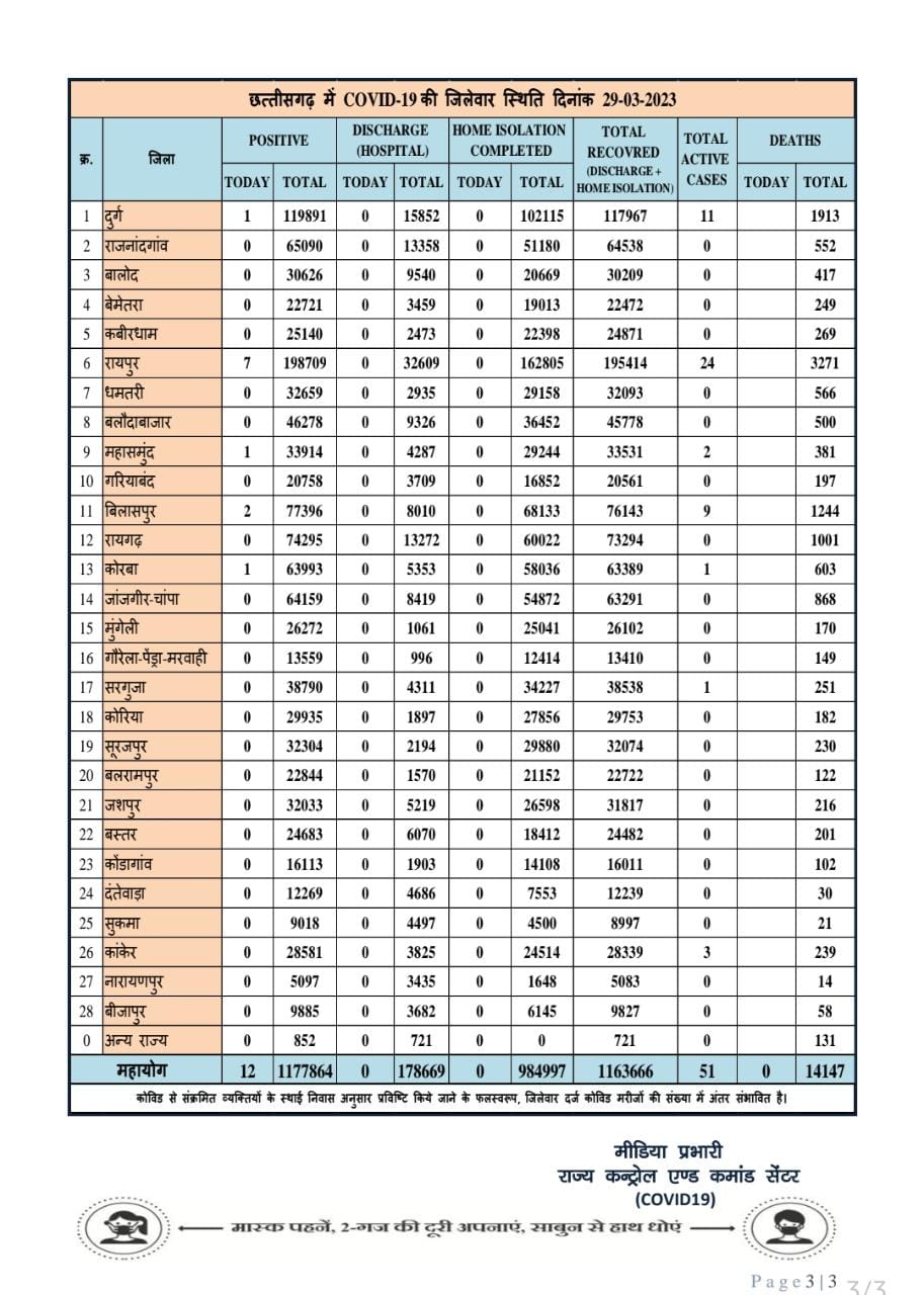 प्रदेश में आज 29 मार्च को 05 जिला रायपुर से 07 बिलासपुर से 02, दुर्ग, महासमुंद एवं कोरबा से 01-01, कोरोना संक्रमित पाए गए तथा शेष जिलों में कोरोना का कोई नया मामला नहीं आया है।